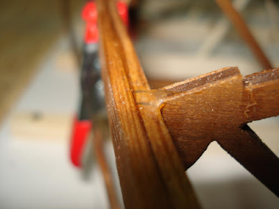 Nach der Reparatur von Spant #8 wurden Kimmweger und äußeren Deckstringer angepasst und verleimt. Die "untere" Lage wurde jeweils zuerst am Bug und Spant #2 befestigt. Nach dem Trocknen wurden die 3x5mm Leisten dann zum Heck hin über die Spanten geleimt und mit Klemmen und Stoßnadeln gesichert. Die Stabilität war nach dem Anbringen der ersten Lage dieser 4 Verbindungen schon so hoch, dass ich überlege in den Pläne die einfache Verwendung von 3x5mm Leisten dafür vorzusehen. Mal sehen, wie es nach dem Schleifen aussieht.