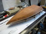 Nach dem verschleifen war die Decksbeplankung an der Reihe. Vorab mit Schablone angepasst und dann auf 0,8 mm FSH übertragen. Das Sperrholz habe ich bereits vor dem verleimen gebeizt. Zum Schutz der Oberfläche habe ich es mit Malerkrepp abgeklebt.