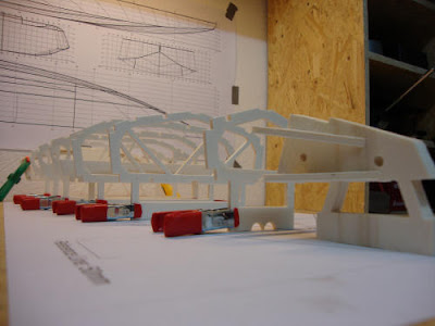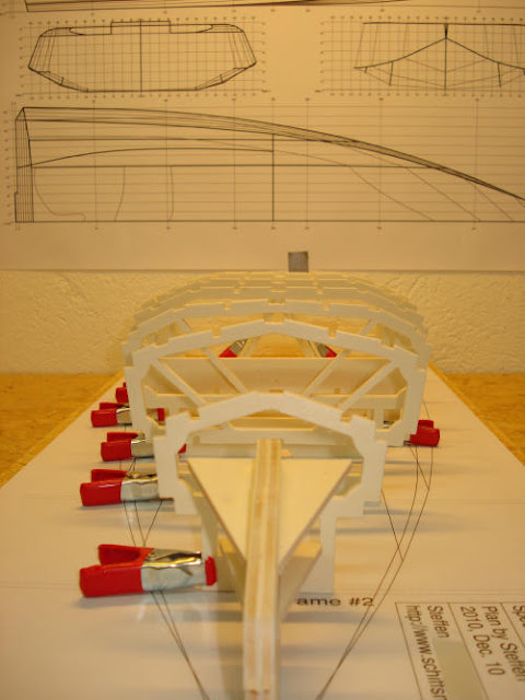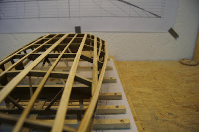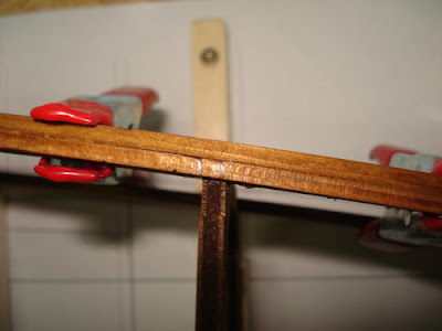 Nach der Reparatur von Spant #8 wurden Kimmweger und äußeren Deckstringer angepasst und verleimt. Die "untere" Lage wurde jeweils zuerst am Bug und Spant #2 befestigt. Nach dem Trocknen wurden die 3x5mm Leisten dann zum Heck hin über die Spanten geleimt und mit Klemmen und Stoßnadeln gesichert. Die Stabilität war nach dem Anbringen der ersten Lage dieser 4 Verbindungen schon so hoch, dass ich überlege in den Pläne die einfache Verwendung von 3x5mm Leisten dafür vorzusehen. Mal sehen, wie es nach dem Schleifen aussieht.