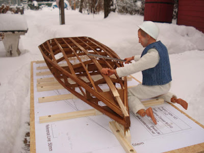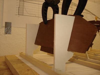 Die Bodenstringer mit stärkerer Biegung am Bug, wurde in eine Nagelform gezwungen und etwa 10 Minuten über einem Topf mit siedendem Wasser gehängt. Nach dem Abkühlen und Trocknen waren sie formstabil und konnten spannungsfrei verklebt werden.