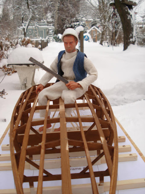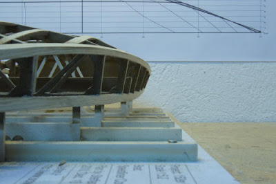 Zum Schluss wurde die zweite Lage Leisten auf die Kimmweger und äußeren Deckstringer geleimt. Ein guter Teil dieser 2. Lage wird dem Schleifen wieder zum Opfer fallen, um einen guten Strak zu erreichen. Die Aussparungen waren also richtig dimensioniert und die Wahl der Grundlinie und der Positionierung der Spanten vor dieser Linie in Richtung Heck war ebenfalls richtig. Nirgendwo "fehlt" Material um strakende Linien zu erhalten.