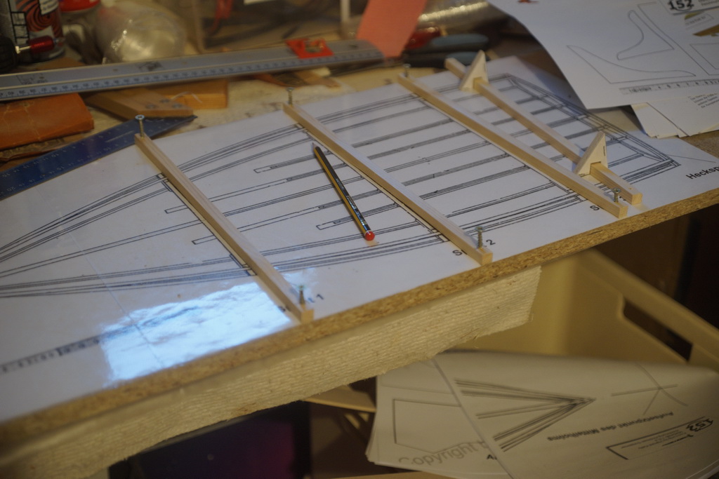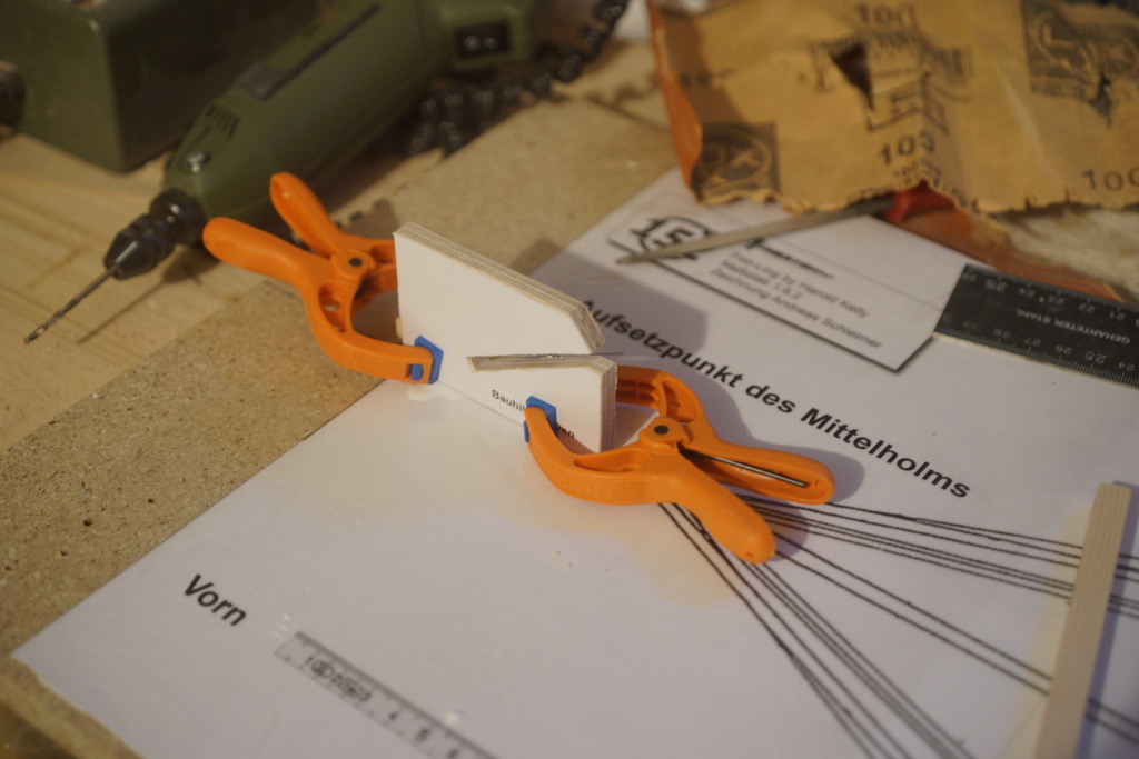 Dem entsprechend haben wir Gestern Abend auch schon ein Baubrett beklebt und mit Folie überzogen. Die Idee wurde honoriert, denn da klebt nichts drauf. Einen Spant haben wir auch schon fertig und so wird das jetzt kontinuierlich weiter gehen.